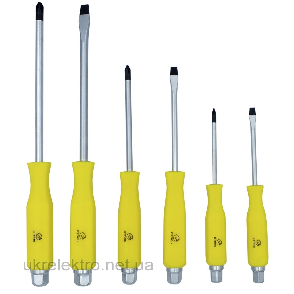 Набір ударних викруток Сталь 6 шт - інструменти призначені для загвинчування та відгвинчування кріпильних елементів з різьбленням, на головці яких є хрестоподібний і прямий шліц PH і SL. Виготовлений із високоякісної хром - ванадієвої сталі CrV. Пластикова рукоятка забезпечує зручне захоплення та ефективне обертання викрутки. Робоча частина магнітна.