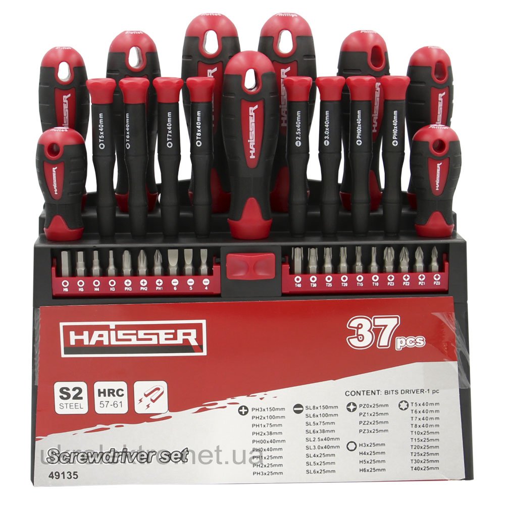 Набір викруток Haisser - якісний набір з 12 викруток та 24 біт, а також викрутка тримач магнітна. Інструменти призначені для загвинчування та відгвинчування кріпильних елементів. Виготовлені з високоякісної хром - ванадієвої сталі S2, що пройшла вакуумну термообробку. Двокомпонентна рукоятка забезпечує зручне захоплення та ефективне обертання викрутки. Робоча частина магнітна.