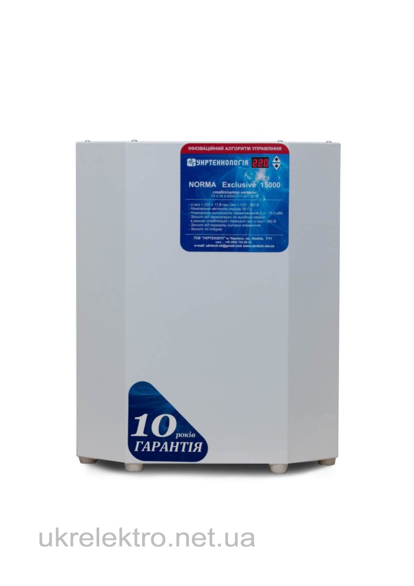 Точність стабілізації ± 5%, Число ступенів автоматичного регулювання — 12 ст., Граничний діапазон вхідної напруги: 60-285 V., Потужність 15 кВА.,