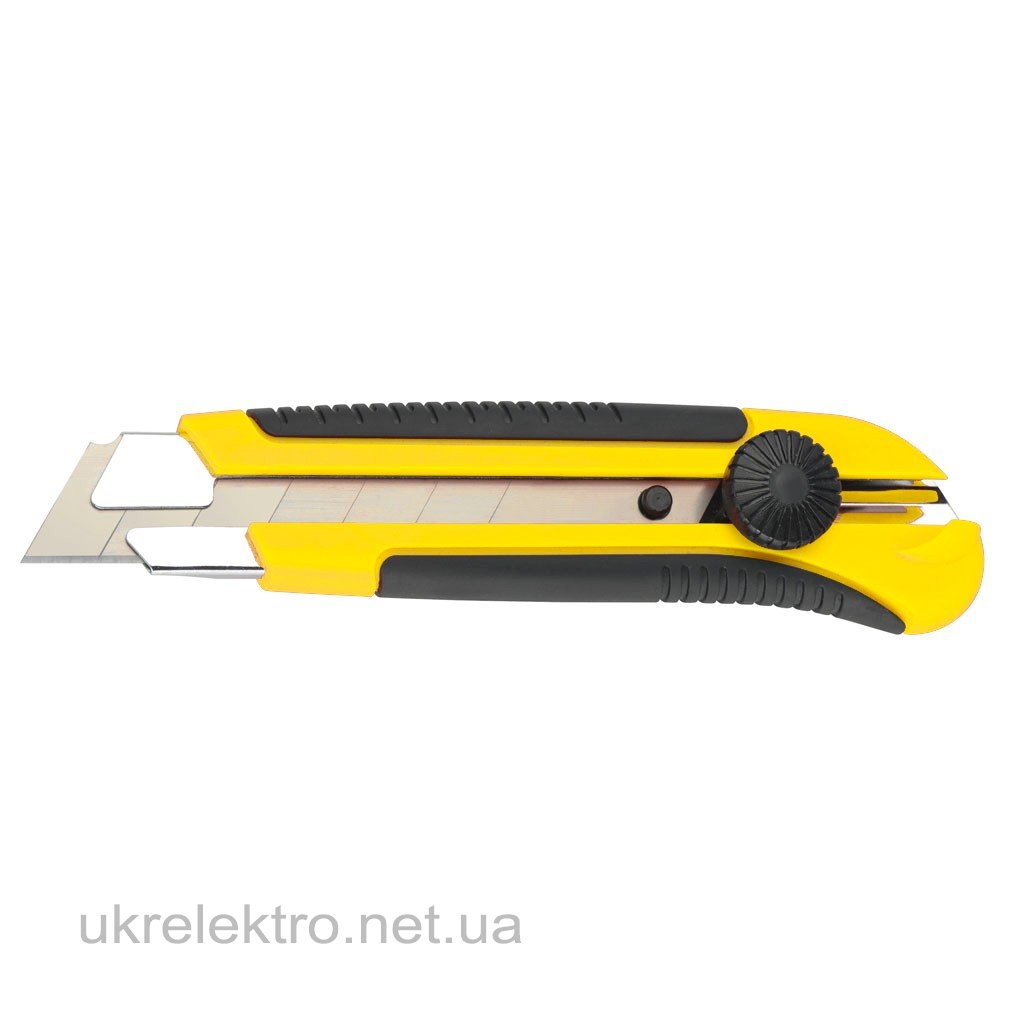 Ніж металевий 25 мм Сталь - для розрізання щільного паперу, картону, плівки, лінолеуму, покрівельних матеріалів, виробів з гуми та шкіри та інших матеріалів. Лезо сегментоване. Зручна ручка ножа забезпечує комфортне використання із максимальною безпекою. Металева напрямна леза і блокування леза.