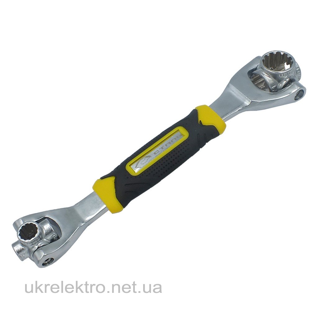 Сталь Ключ універсальний 48 в 1 Сталь - призначений для відкручування і закручування гайок і болтів розміром від 8 до 19 мм. Ключ поєднують у собі 8 розмірів: 8, 10, 11, 13, 14, 16, 17, 19 мм., кожен ключ може захопити наступний тип гайок: Hexagonal, 12 point, Round Hex, Square, Spline, T-X., тому один такий ключ може замінити 48 стандартних гайкових ключів. Головка ключа обертається на 360 градусів та фіксується. Кут нахилу ключа 45 градусів, що дозволяє підібратися до гайок, які знаходяться у важкодоступних місцях. Виготовлений із високоякісної хром - ванадієвої сталі CrV.