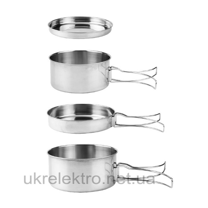 Набір посуду для активного дозвілля GUSTO - це ідеальне рішення для любителів подорожей, кемпінгу, пікніків та інших активних видів відпочинку. Набір складається з великої та маленької каструлі, сковорідки та тарілки, які дозволяють готувати різноманітні страви на відкритому вогні. Всі предмети виготовлені із міцної та надійної нержавіючої сталі, яка витримує високі температури.