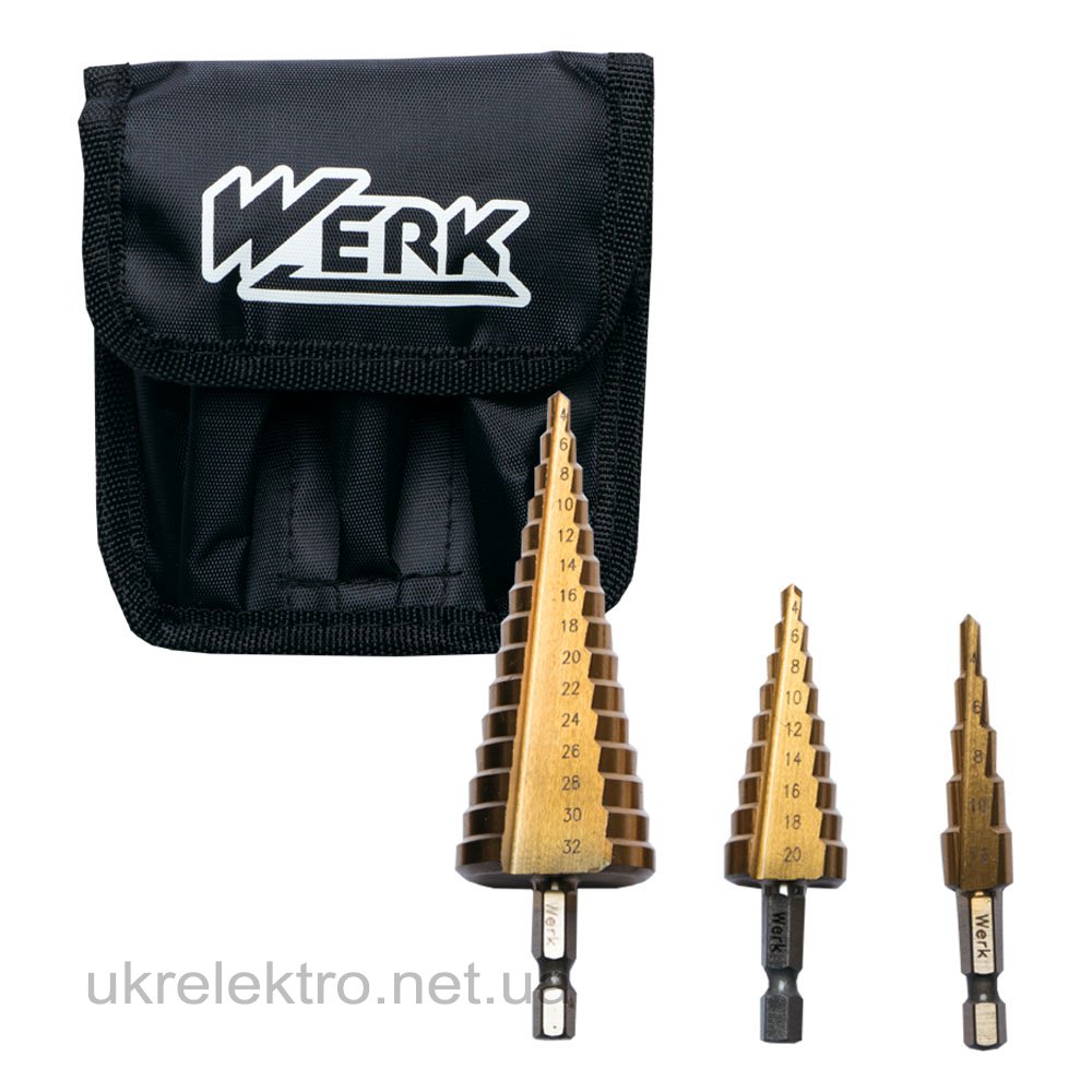 Опис Набір свердел східчастих 4-32 мм Werk Набір свердел східчастих 4-32 мм Werk - конічної форми, використовується для делікатного свердління отворів великого діаметру в листових металах і пластиці. Ступінчаста структура дозволяє свердлити отвори різного діаметру, без заміни ріжучого інструменту. Дві широкі канавки без праці відводять стружку і забезпечують охолодження робочої частини інструменту. Всередині однієї з канавок нанесена шкала діаметрів, що значно спрощує роботу. Виготовлено з високоміцної швидкорізальної сталі. Глибина кроку дозволяє робити наскрізні отвори в листових матеріалах, профілях і трубах, до 4 мм.