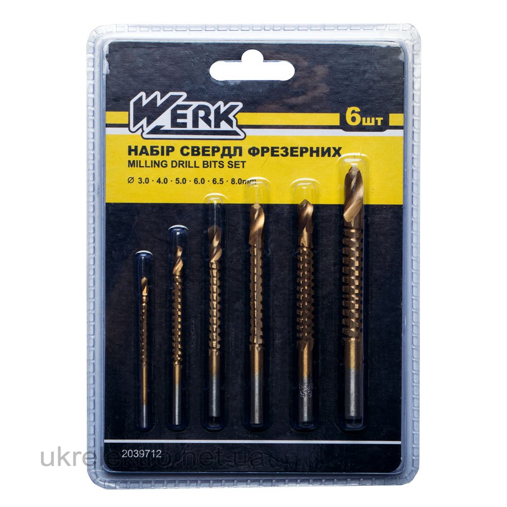 Опис Werk Набір фрезерних свердел 3.0-8.0 мм Набір фрезерних свердел Werk - складається з 6 фрезерних свердел з бічними гострими насічками (3.0, 4.0, 5.0, 6.0, 6.5, 8.0 мм). Призначені для свердління або розсвердлювання наскрізних пропилів, поздовжніх пропилів і поглиблень будь-якої форми Деревини, МДФ, алюмінієвих сплавів, тонких сталевих пластин, пластика, ПВХ, акрилу. Виготовлені з якісної сталі HSS з титановим покриттям.